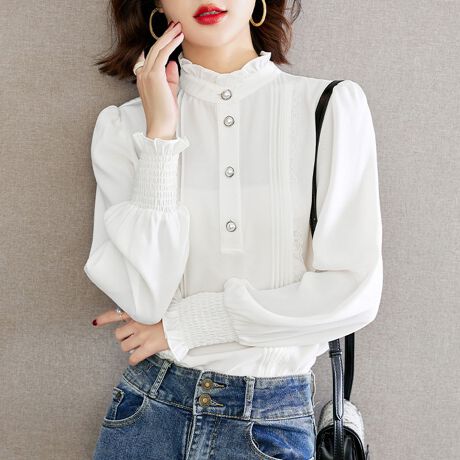 ピンタックとレースを組み合わせたハイネックブラウスです。