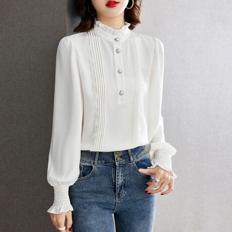 ピンタックとレースを組み合わせたハイネックブラウスです。