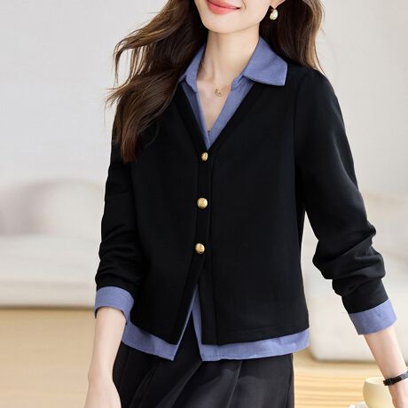 シャツとカーディガンを重ねたようなレイヤード風トップスです。