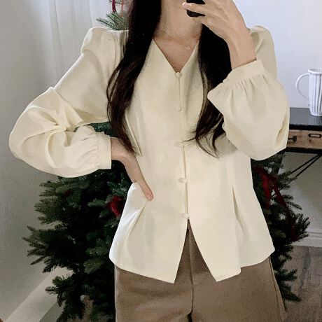 フロントはVネック×ボタン付きで、顔まわりをすっきり見せる構成。