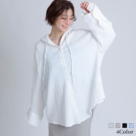 独特な凹凸が魅力の楊柳素材で仕立てたフーディーシャツ。