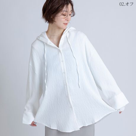 独特な凹凸が魅力の楊柳素材で仕立てたフーディーシャツ。