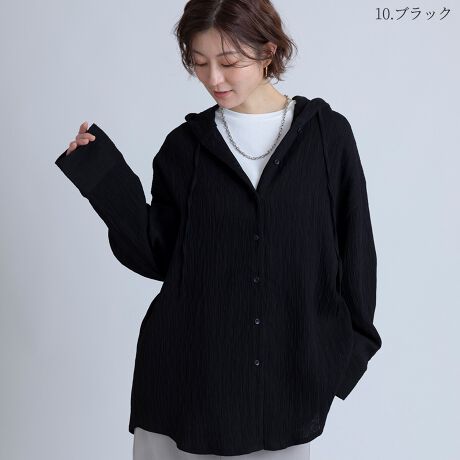 独特な凹凸が魅力の楊柳素材で仕立てたフーディーシャツ。