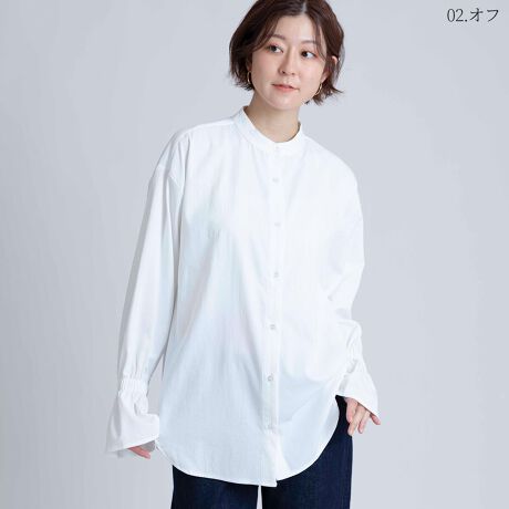 すっきりとしたバンドカラーに、ふっくらとフェミニンなキャンディスリーブが目を惹くデザインです♪