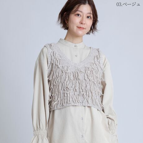 ざっくりとした編み地に施したボリュームたっぷりのループヤーンが動くたびに揺れ動く華やかな一枚です。