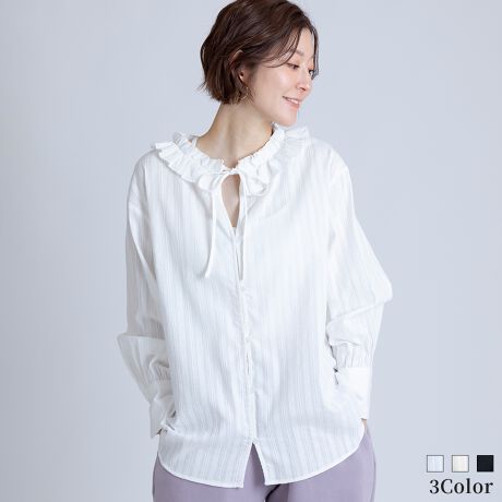 お顔周りをパッと華やかに見せてくれるリボン付きのギャザーフリルは大人の可愛らしさを程よく引き立ててくれます。