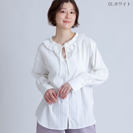お顔周りをパッと華やかに見せてくれるリボン付きのギャザーフリルは大人の可愛らしさを程よく引き立ててくれます。