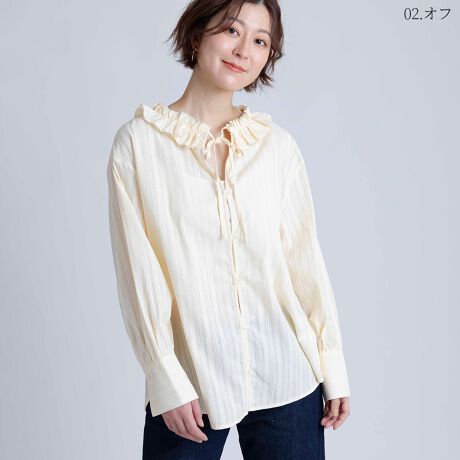 お顔周りをパッと華やかに見せてくれるリボン付きのギャザーフリルは大人の可愛らしさを程よく引き立ててくれます。