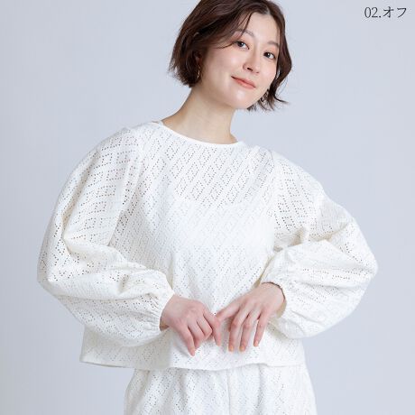 さりげない肌見せと旬のボリューム感でコーデを格上げしてくれるアイレットレースプルオーバー。