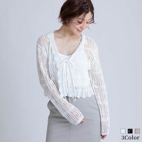 ロマンティックムードあふれる透かし編みが目を惹くカーディガン。
