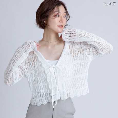 ロマンティックムードあふれる透かし編みが目を惹くカーディガン。