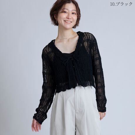 ロマンティックムードあふれる透かし編みが目を惹くカーディガン。