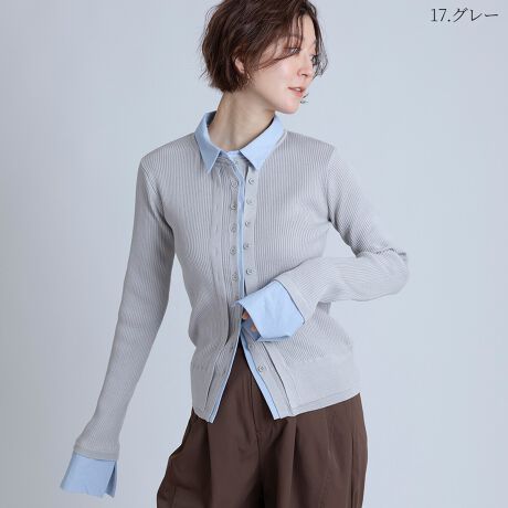 シャツを重ねたようなデザインがポイントのリブニットカーディガン。