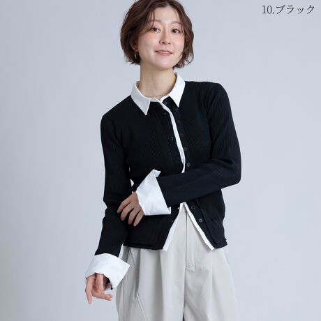 シャツを重ねたようなデザインがポイントのリブニットカーディガン。