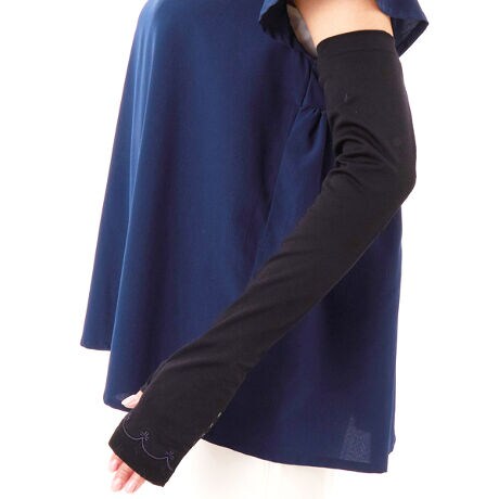 [型番:6141LA6322101]一番人気の小花チュールの新デザイン。刺繍がエレガントです。指無しロングタイプ。長さ:50cm。遮蔽率:99.1%機能:保湿接触冷感。親指穴あり。