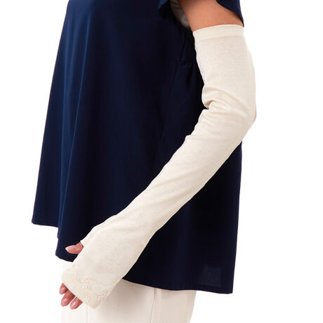 [型番:6141LA6322195]一番人気の小花チュールの新デザイン。刺繍がエレガントです。指無しロングタイプ。長さ:50cm。遮蔽率:96.6%機能:保湿接触冷感。親指穴あり。