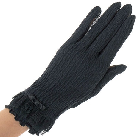 [型番:6141LA6502101]楊柳生地でストレッチ性もあり、涼しげな企画です。フリルとリボンのデザインは定番の売れ筋です。5本指ショートタイプ。長さ:25cm。遮蔽率:99.7%ストレッチ。