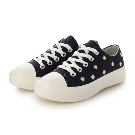・アッパーに施された可愛らしい花柄刺繍がアクセントのローカットスニーカーです。ベーシックなキャンバス地に白い靴紐とラバーソールを組み合わせた、どんなコーディネートにも合わせやすい定番のデザインです。軽量で歩きやすく、デイリーユースからちょっとしたお出かけまで幅広く活躍します。