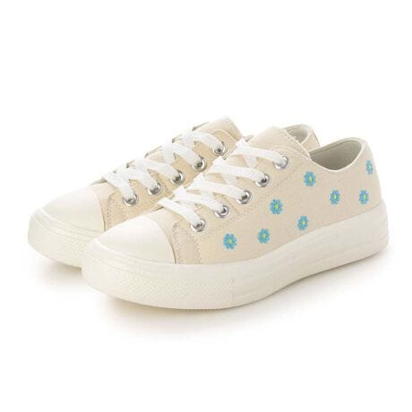 ・アッパーに施された可愛らしい花柄刺繍がアクセントのローカットスニーカーです。ベーシックなキャンバス地に白い靴紐とラバーソールを組み合わせた、どんなコーディネートにも合わせやすい定番のデザインです。軽量で歩きやすく、デイリーユースからちょっとしたお出かけまで幅広く活躍します。