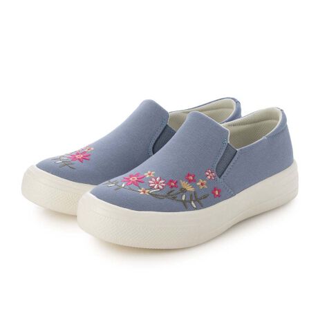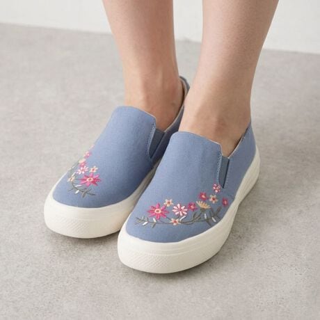レトロで可愛らしい花刺繍がアクセントのキャンバススリッポンです。カジュアルながらも女性らしいデザインで、幅広いコーディネートに合わせやすい一足です。