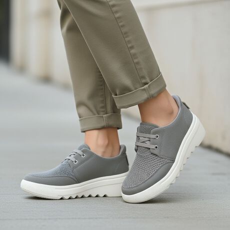 メッシュ素材で通気性が良く、シーズン問わず快適に履けるスニーカーです。ウェッジソール(厚底)デザインで、スタイルアップ効果がありながらも安定感があり、非常に歩きやすいのが魅力です。軽量で疲れにくいため、日常使いはもちろん〇