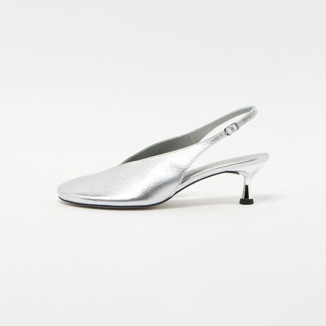 華奢な約5cmのヒールは光沢感のある素材で、アッパーとのコントラストがモダンな印象。