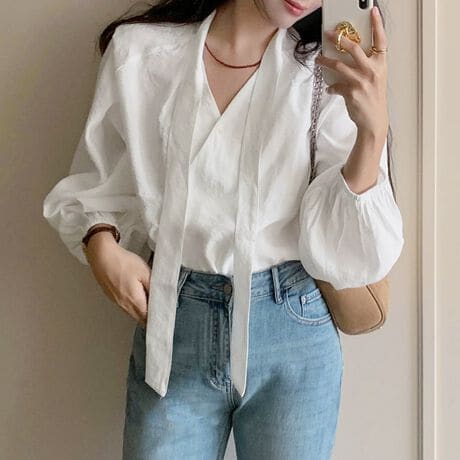 ボウタイ付きVネックパフスリーブブラウス