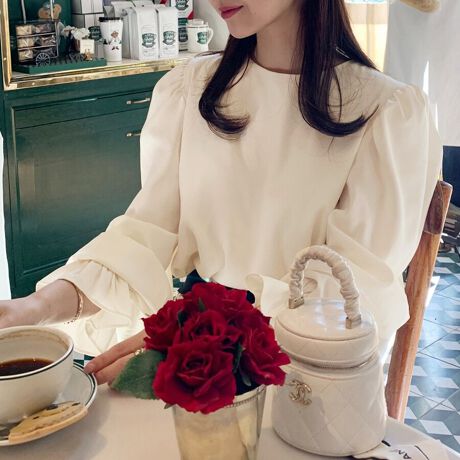 袖はふんわりとしたパフスリーブで、袖口にギャザーが入り柔らかな印象に仕上がっています。