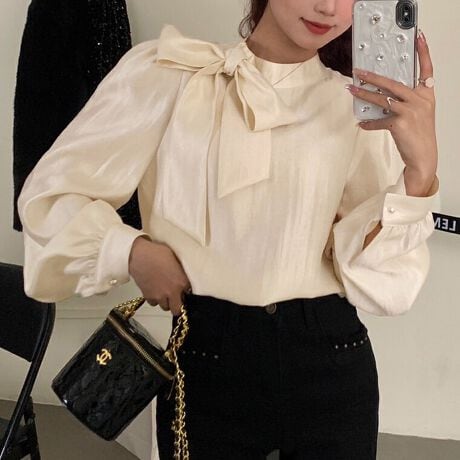 大きめのボウタイが目を惹く長袖ブラウスです。