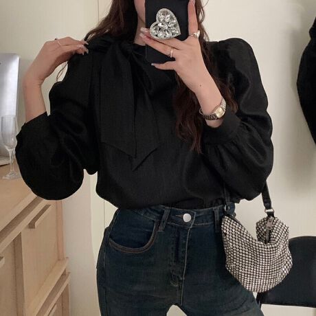 大きめのボウタイが目を惹く長袖ブラウスです。