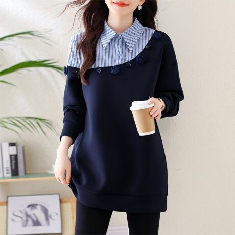 シャツレイヤード風の長袖チュニックは、襟元と胸元にストライプ柄の切替が施されています。