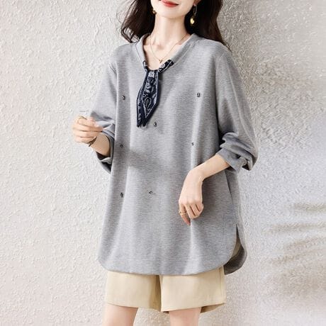 スカーフ付きの長袖プルオーバーは、首元にアクセントを添える華やかなデザインです。