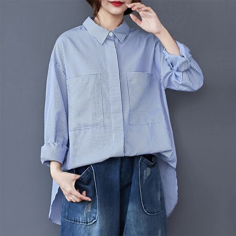 ストライプ柄の長袖シャツは、ゆったりとしたシルエットでリラックス感のある着心地です。
