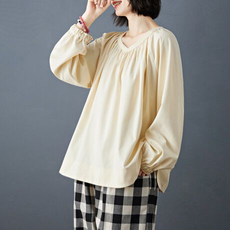 ギャザーネック仕様の長袖ブラウスは、首元に立体感を生み出すデザインです。