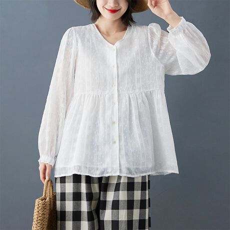 ギャザー入りの長袖ブラウスは、ウエスト切替でペプラム風のシルエットが広がります。
