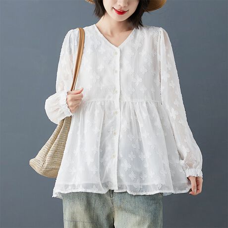 花柄の立体デザインが印象的な長袖ブラウスです。
