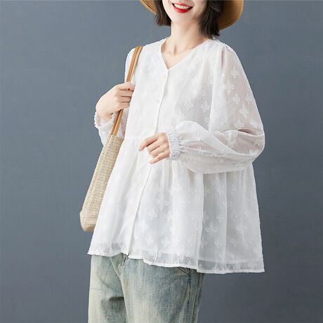 花柄の立体デザインが印象的な長袖ブラウスです。