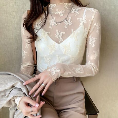 花柄レース×ハイネックトップス レディース トップス