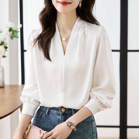 襟元はすっきりと開いたVラインで、顔まわりに抜け感をプラスします。