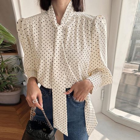ドット柄×タイ付きブラウス