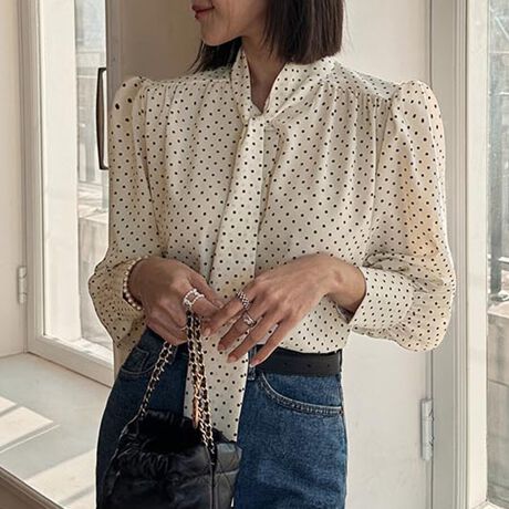 ドット柄×タイ付きブラウス