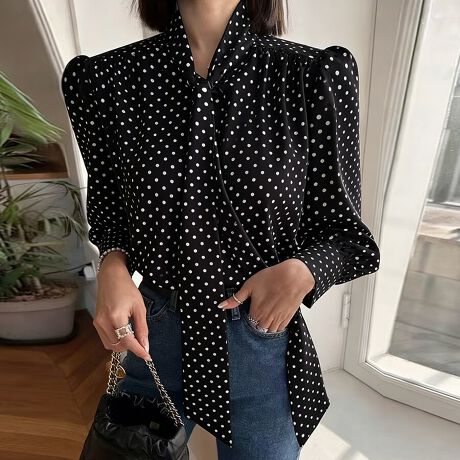 ドット柄×タイ付きブラウス