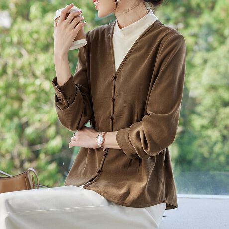 首元はすっきりとしたVネックで、顔まわりをシャープに見せる構成。