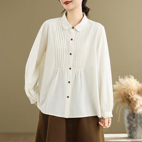 ラウンドカラー×プリーツ入りデザインが映える長袖ブラウスです。