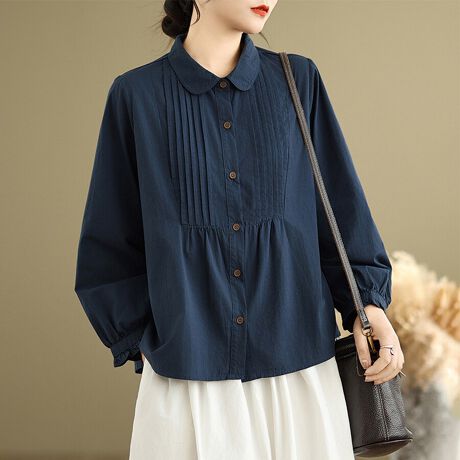 ラウンドカラー×プリーツ入りデザインが映える長袖ブラウスです。