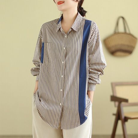 襟元はシャツカラーで、きちんと感と抜け感を両立した構成。