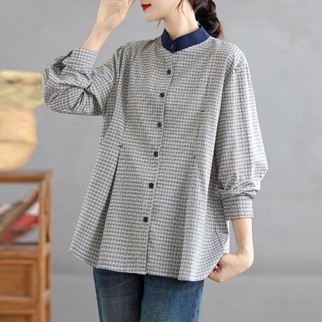 千鳥柄切替が映えるスタンドカラーブラウスです。
