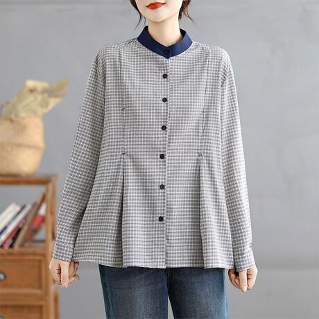 千鳥柄切替が映えるスタンドカラーブラウスです。