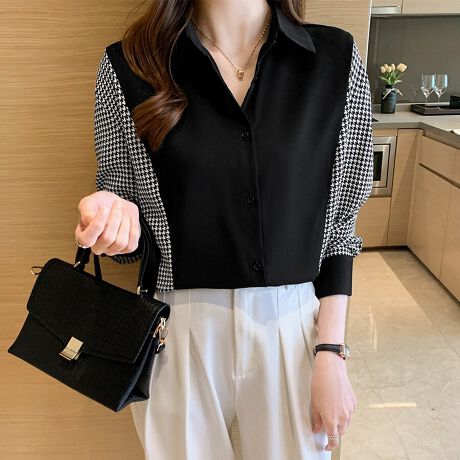 千鳥柄スリーブ×切替デザインが映える長袖ブラウスです。