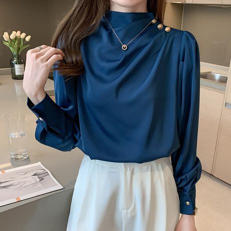 ドレープデザイン×ゴールドボタンが映える長袖ブラウスです。